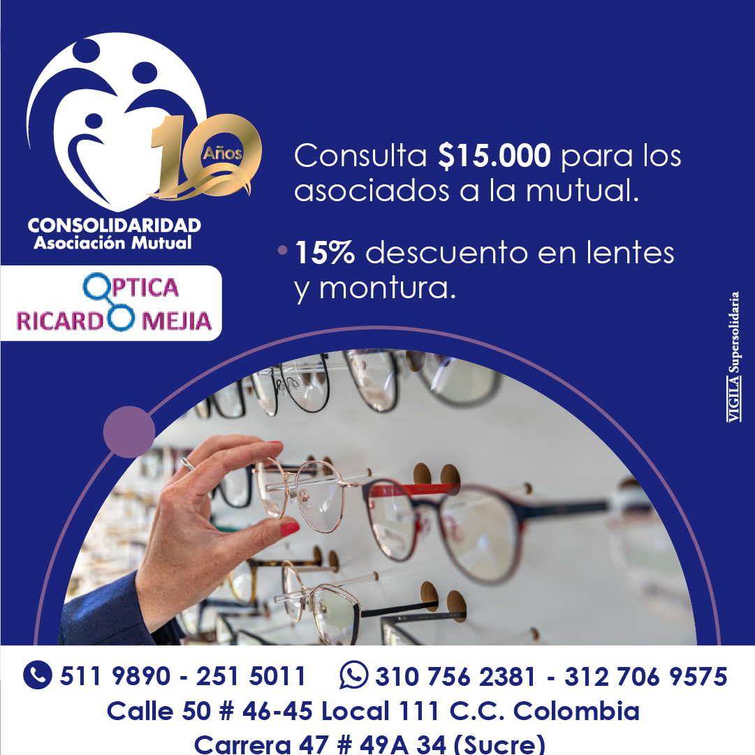Aprovecha descuentos exclusivos en examen de optometría, lentes y monturas. Por ser Asociado a Consolidaridad.