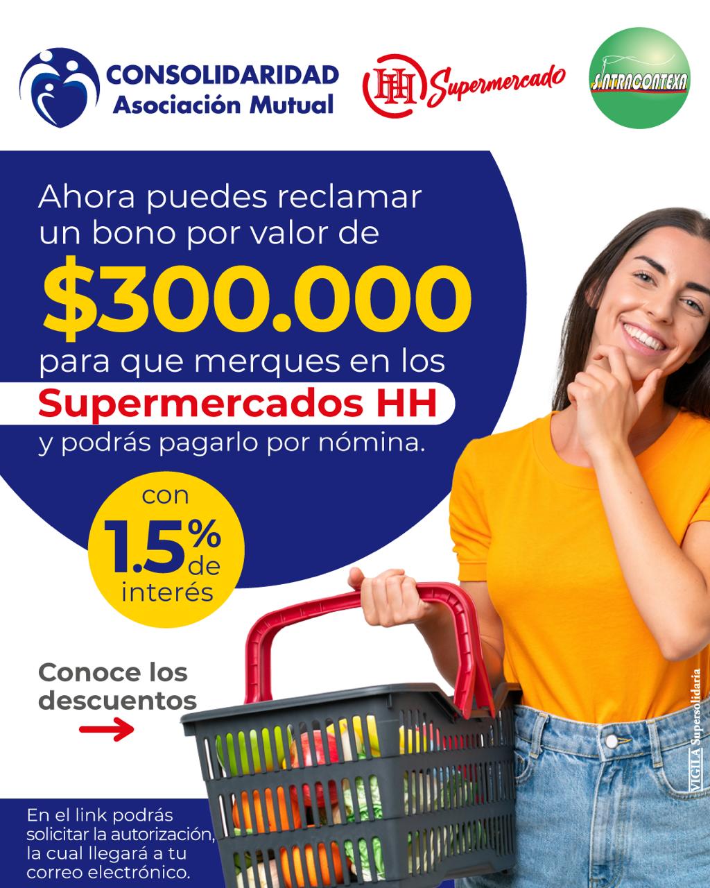 Siguiendo con la filosofía de contribuir en tiempos de alta inflación traemos un convenio con un cupo de $300.000, para mercar en los supermercados HH, entregas a domicilio en el área metropolitana y descuentos por ser Asociados a Consolidaridad. Dar clic para hacer el pedido
